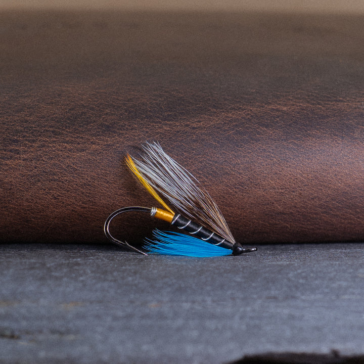 The Blue Charm is one of the most popular salmon flies of all time. First tied in the mid-1800s, it began as a simple British featherwing - often dressed small for low water, with an ostrich herl butt, golden pheasant topping, and a wing of mallard or turkey and teal. Over the years, the pattern evolved, and today, many tiers use grey squirrel in place of the original feathers. The blue hackle, is said to be one of most visible colours in the dim light of early morning or just before nightfall. A classic that continues to hold its place in fly boxes everywhere salmon is pursued.