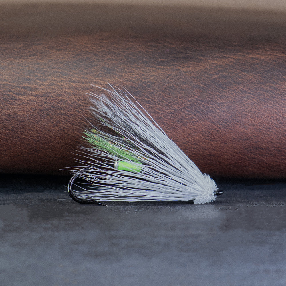 A staple in Québec’s salmon fly wallets, the White Muddler is one of the province’s most trusted patterns. Interesting for its visibility and ability to disturb the water, it offers a striking contrast to softer hackled flies, making it a go-to when salmon require a more assertive presentation. Often seen in various adaptations, this particular version draws inspiration from the Black Bear Green Butt. A proven fly for aggressive takes, it’s a must-have in any salmon fly box.
